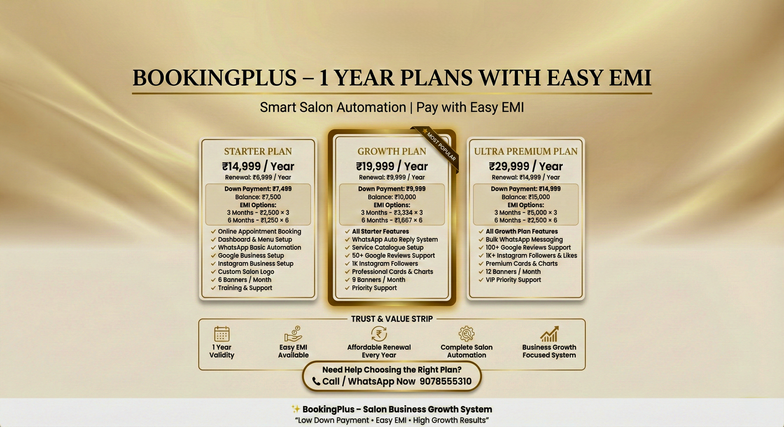 Looking to take your parlour business online? BookingPlus offers three flexible pricing plans designed to suit every salon โ from startups to premium service providers. Enjoy features like verified listings, scanner setup, dashboard access, marketing promotions, and much more. Select the plan that fits your business goals and join the BookingPlus network today!